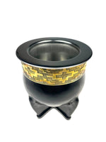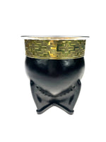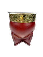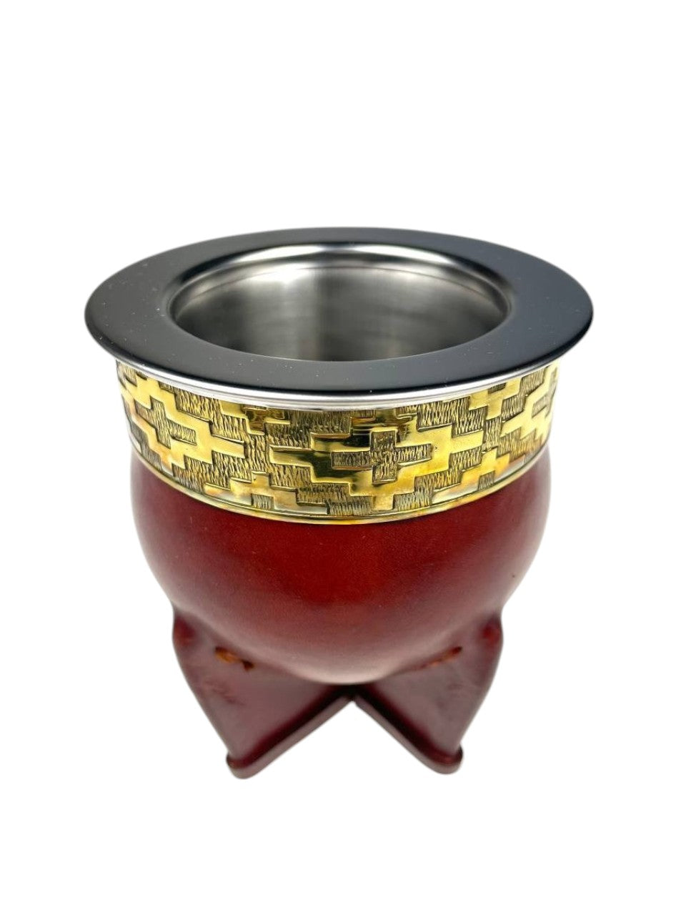 De beker heeft een binnenkant van RVS. Dit maakt dat deze kalebas niet hoeft te rijpen, en je ook geen risico loopt op schimmel. De buitenkant is bedekt met leer, en heeft een goudkleurig versierde ring.