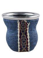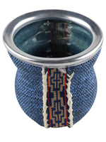 Een kleurrijke, praktische maté beker van glas met een buitenkant van blauw geweven textiel. De decoratieve band met traditioneel geometrisch patroon in donkerblauw, beige en rood is met de hand vastgezet met wit rijggaren, wat de beker een ambachtelijk karakter geeft. De metalen rand zorgt voor een nette afwerking. Met een inhoud van ca. 200 ml is dit een fijn formaat voor dagelijks gebruik.
